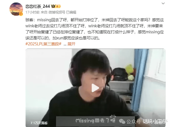 这名知情人就是骇客,他在直播中就透露Missing已经回去了,都已经开始打排位了。他是能拯救这个家的,Wink没打几场他已经顶不住了,Missing已经回来了,但是不知道后续会打成什么样子,但是感觉Missing应该是可以的,再加上打野Xun,JDG的成绩肯定不会太差。